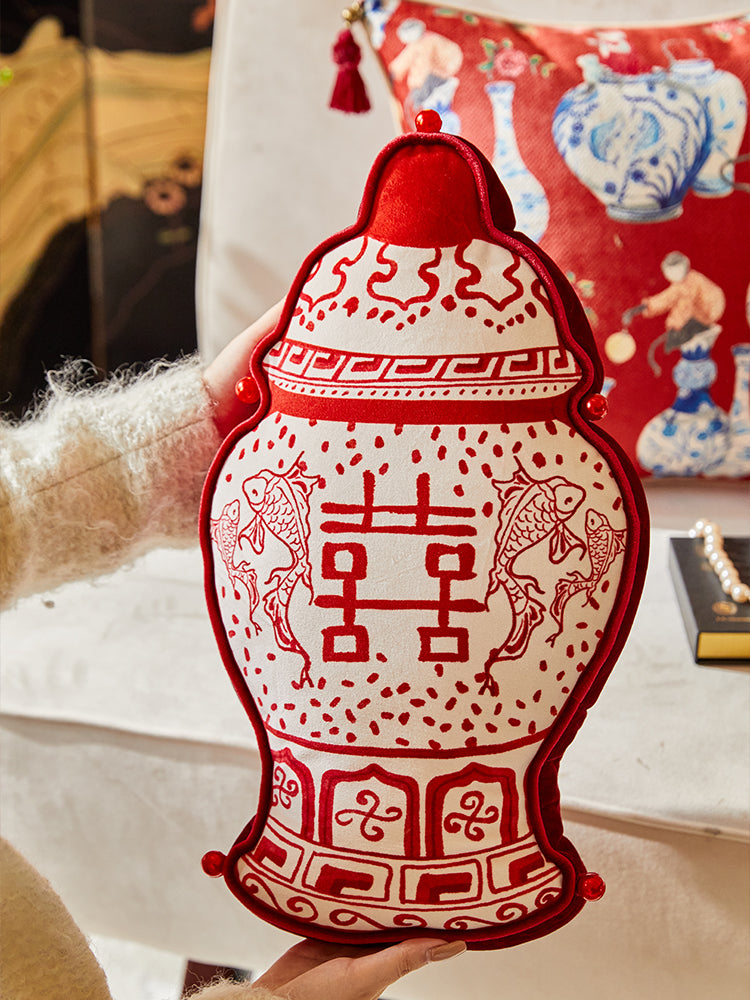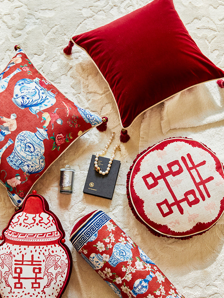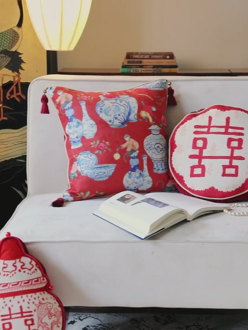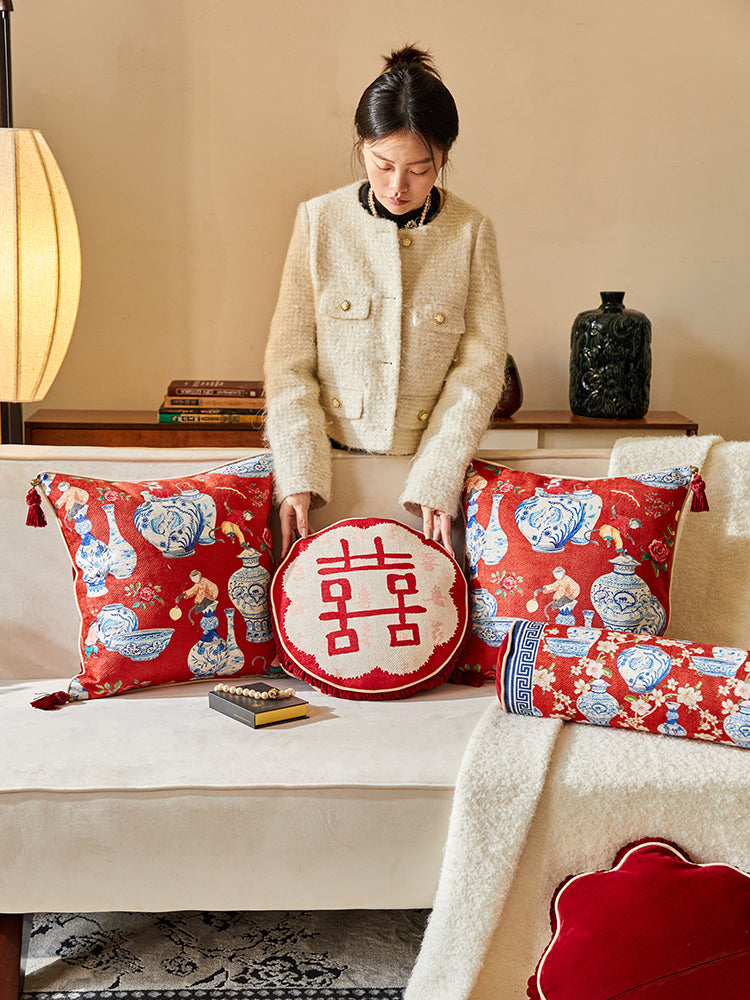 This cushion set features a traditional Chinese design with a red base and blue-and-white porcelain elements, creating a festive and elegant look.