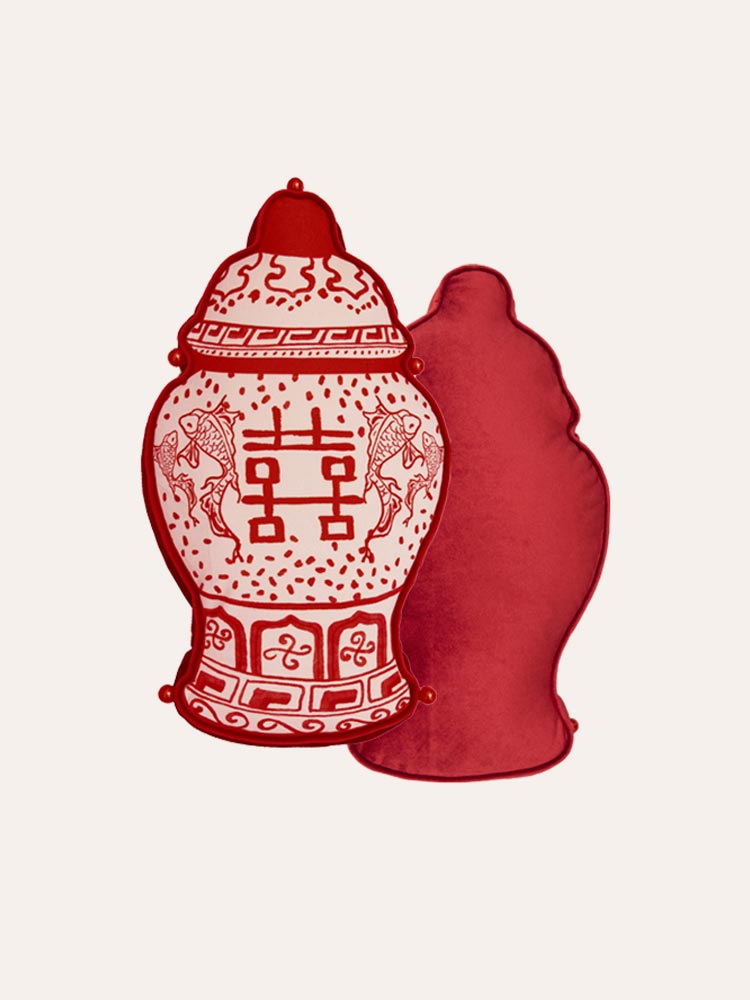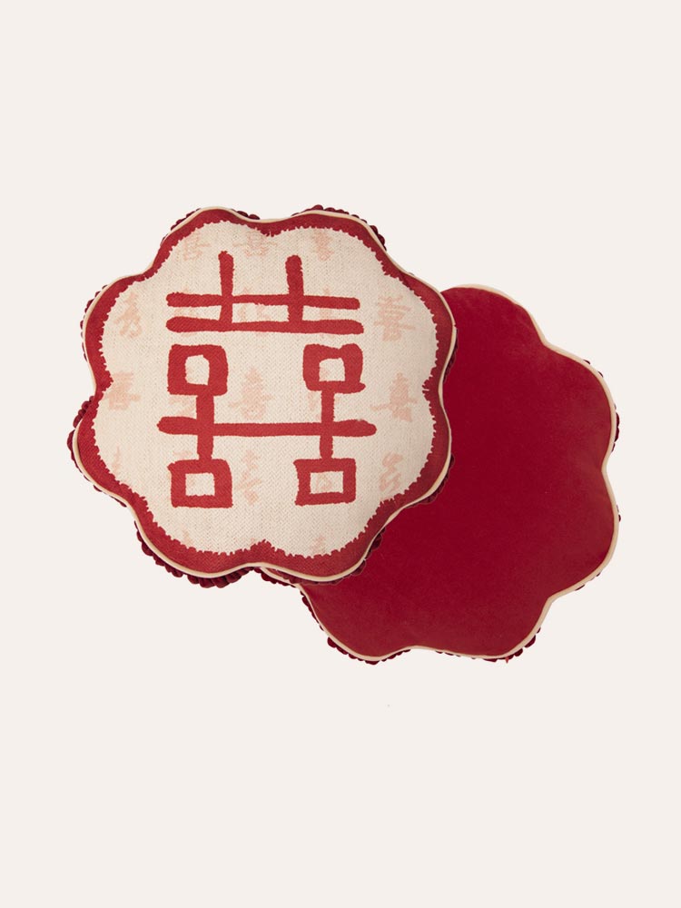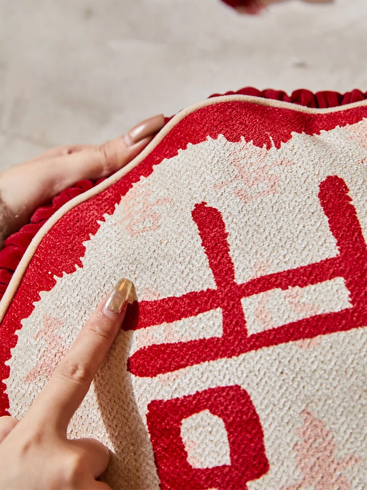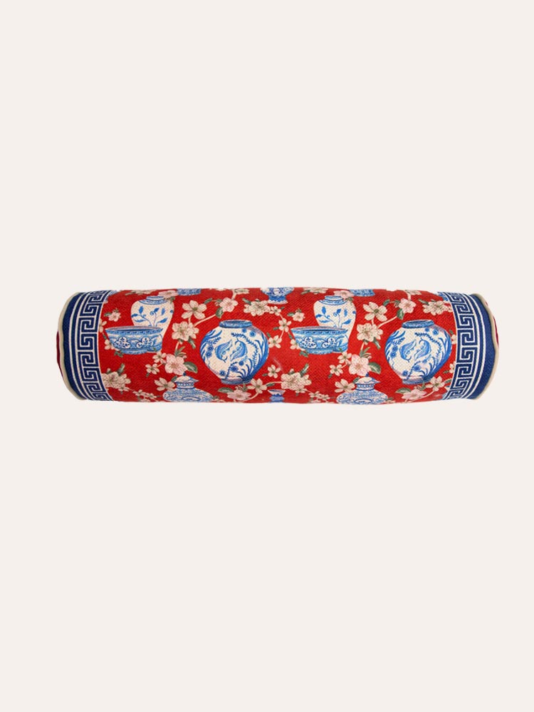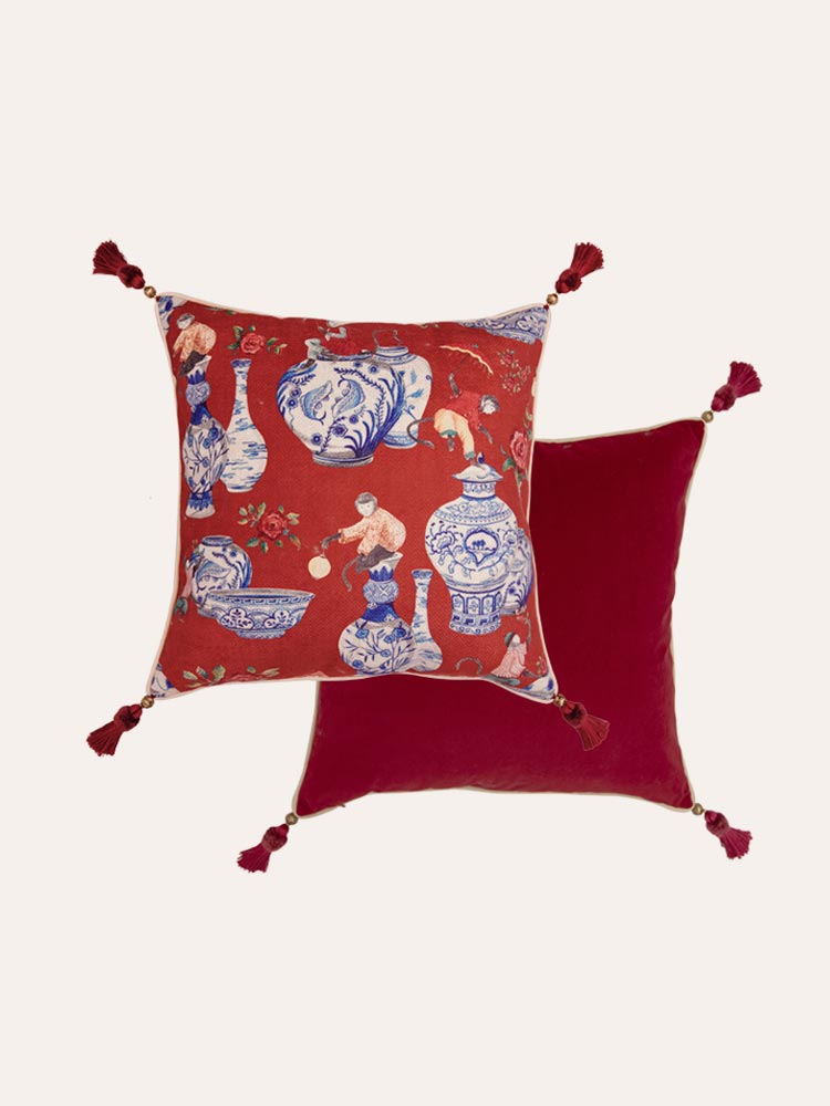 This cushion set features a traditional Chinese design with a red base and blue-and-white porcelain elements, creating a festive and elegant look.
