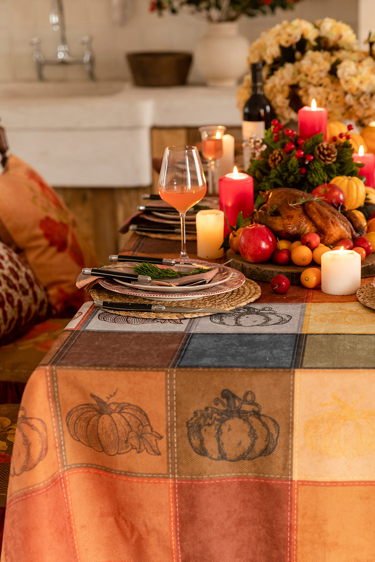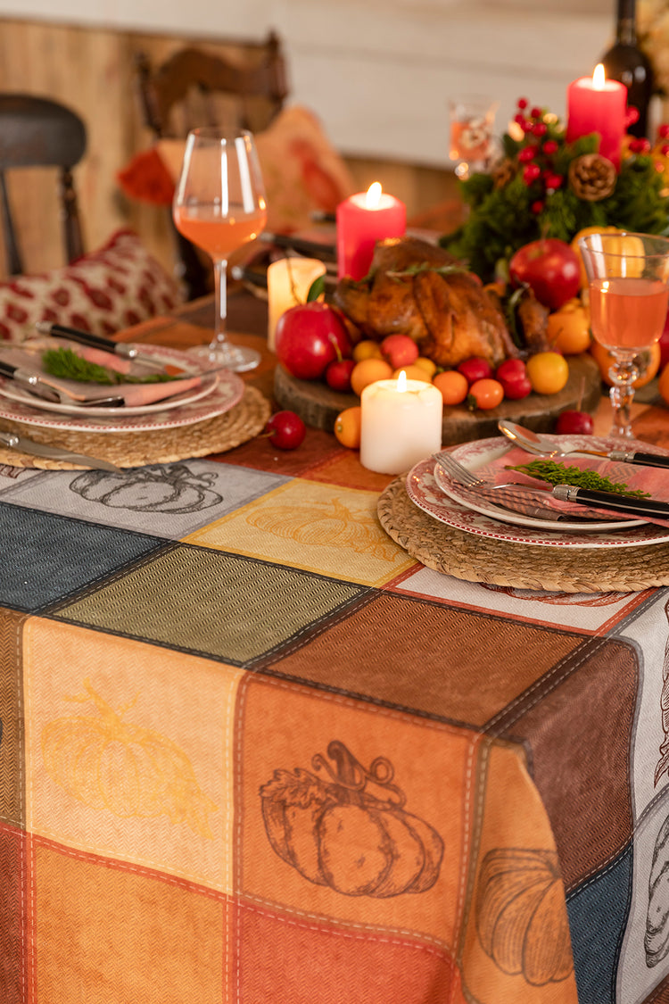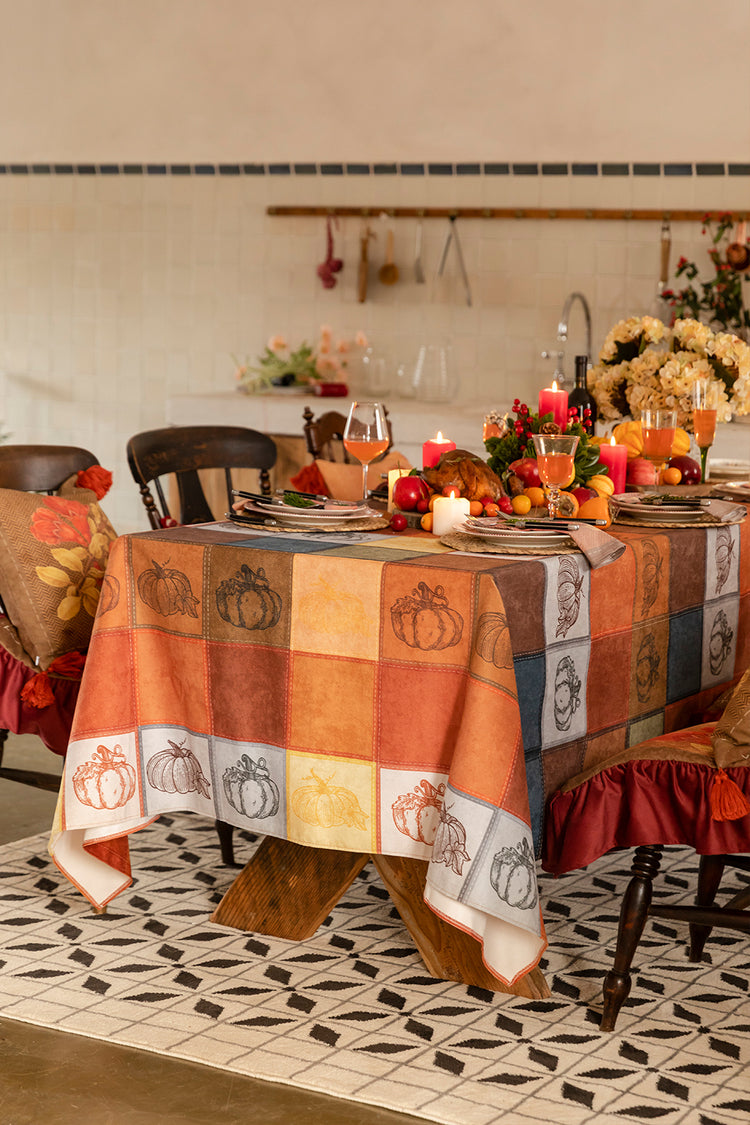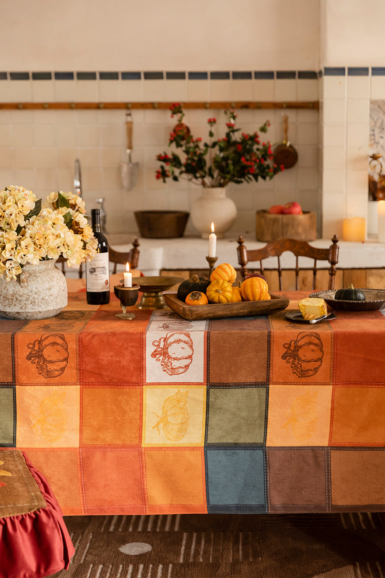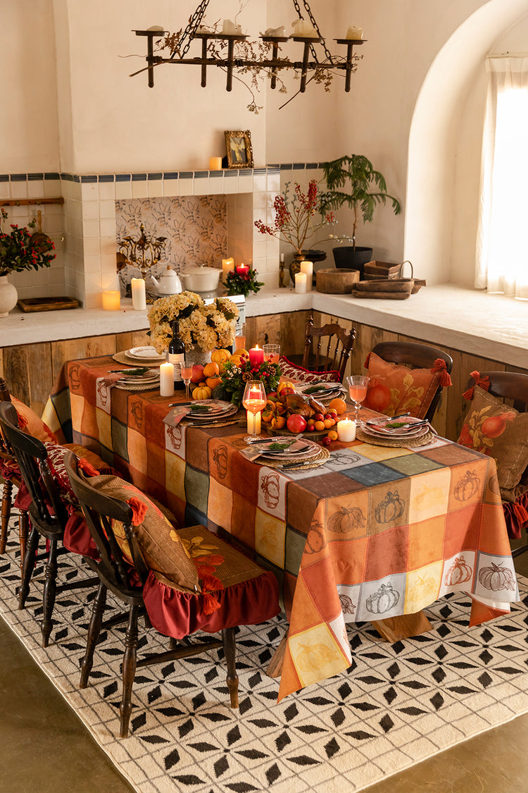 Inspired by the vibrant hues of autumn harvests, this tablecloth showcases a patchwork of earthy tones and seasonal motifs. The design evokes the warmth and abundance of the fall season, celebrating nature’s rich palette and the joy of gathering around the table. X