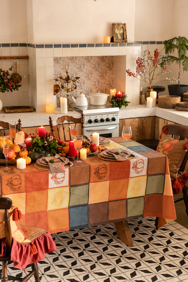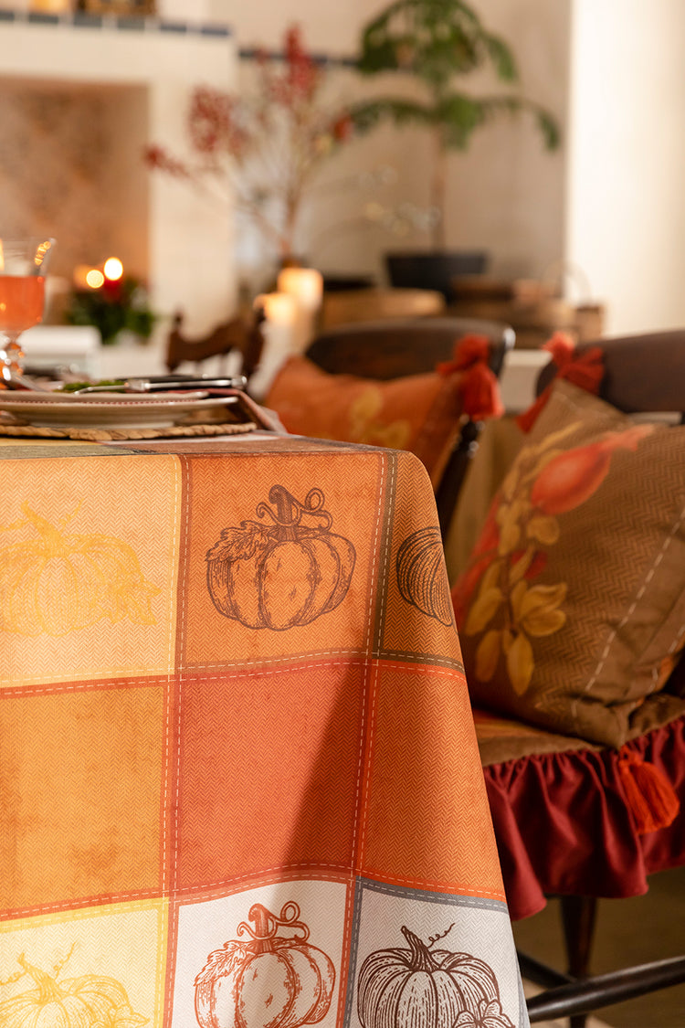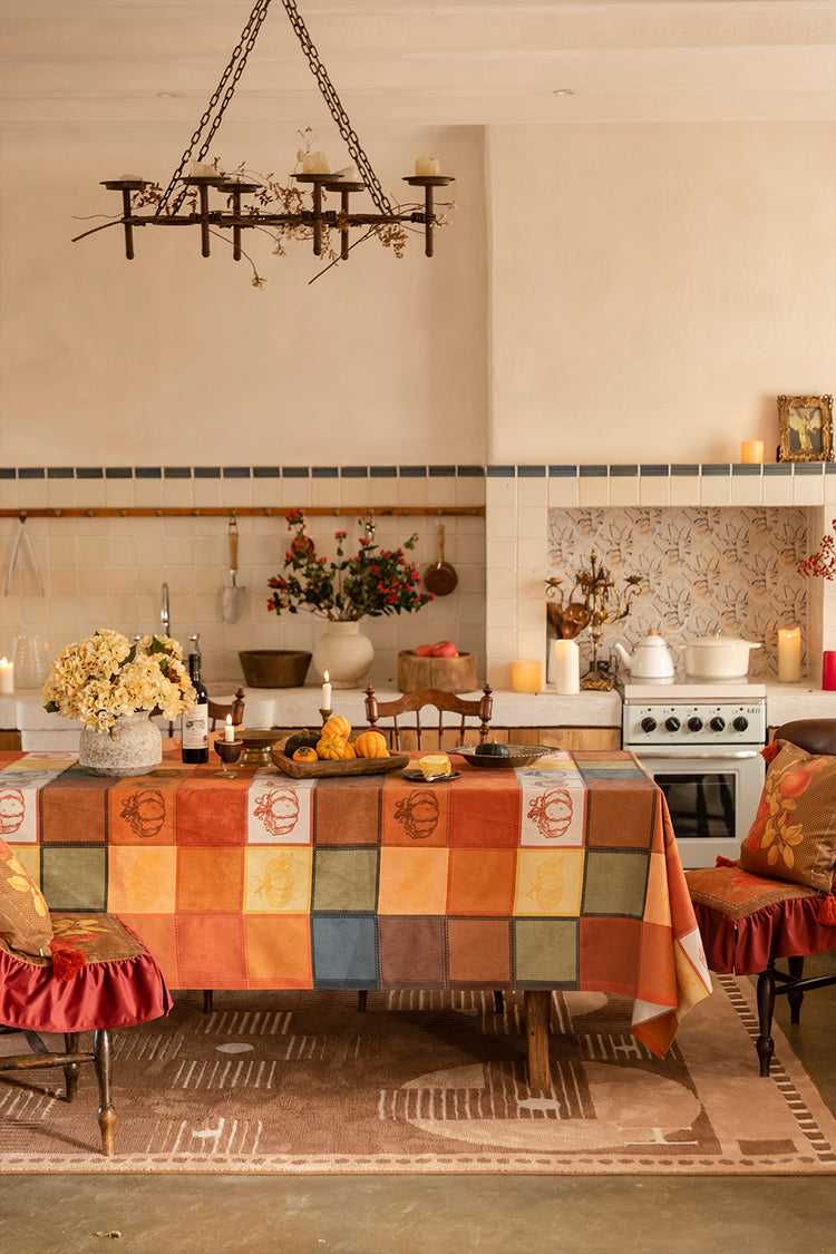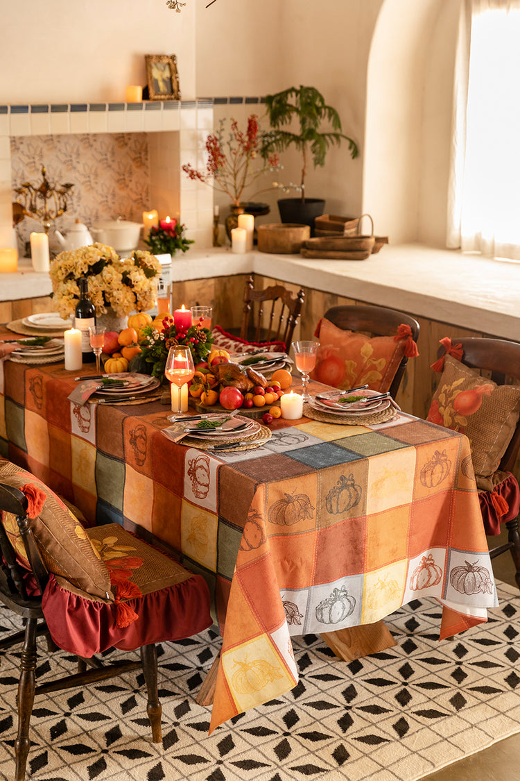 Crafted with precision, the tablecloth showcases vibrant pumpkin motifs intricately arranged in a delicate mosaic pattern, creating a dynamic sense of movement that seems to leap from the fabric.