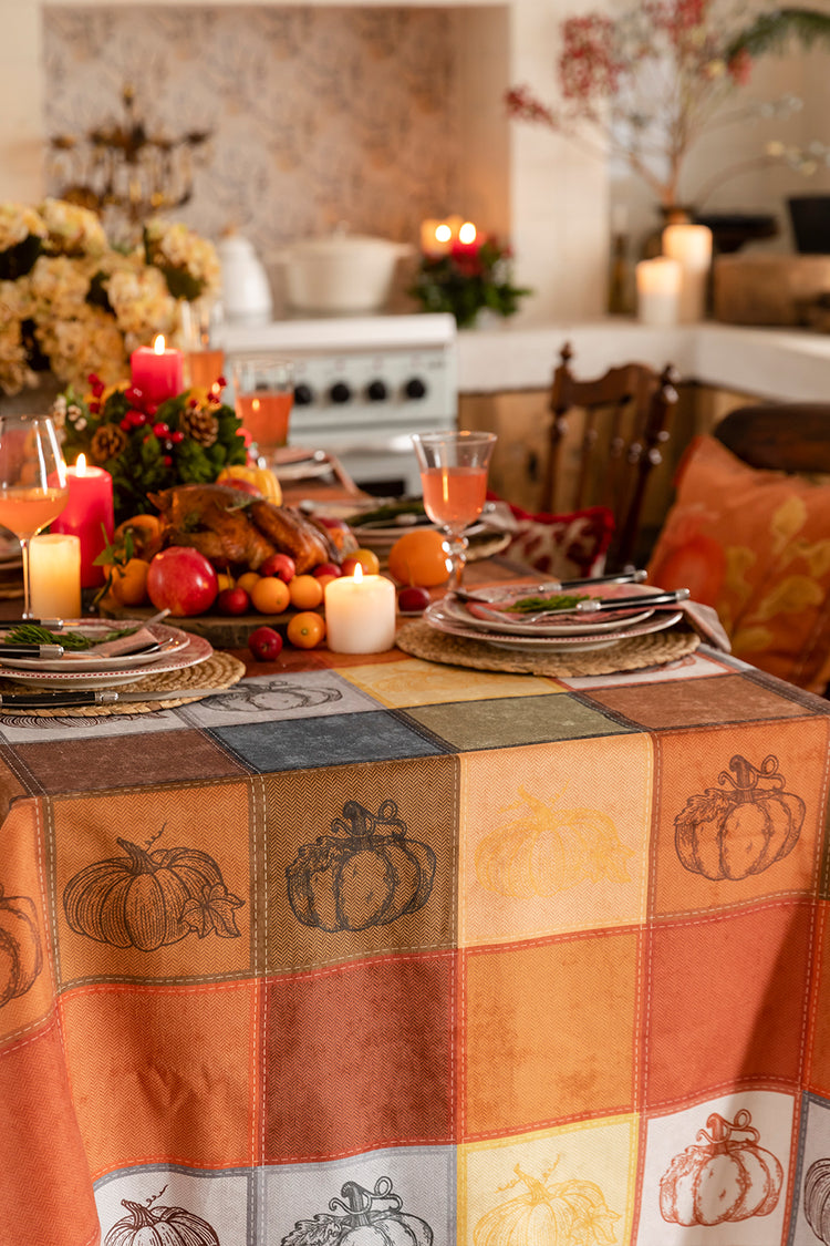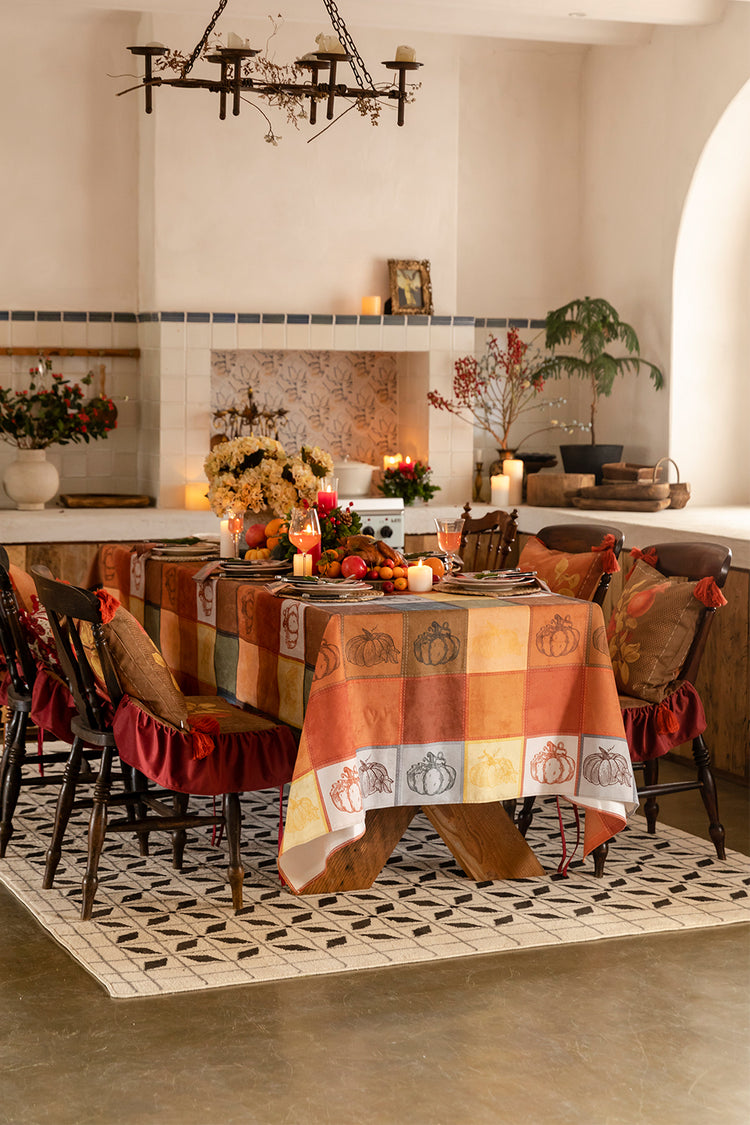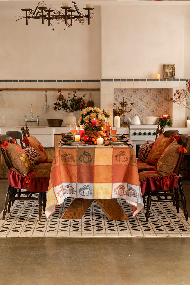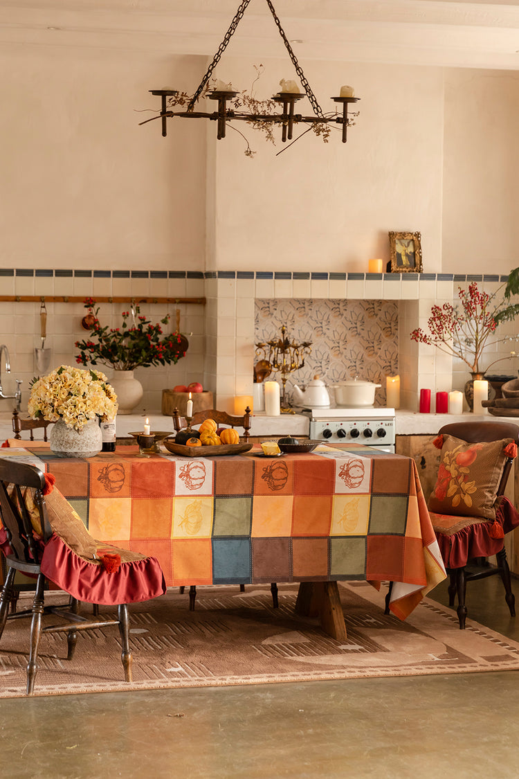 Crafted with precision, the tablecloth showcases vibrant pumpkin motifs intricately arranged in a delicate mosaic pattern, creating a dynamic sense of movement that seems to leap from the fabric.