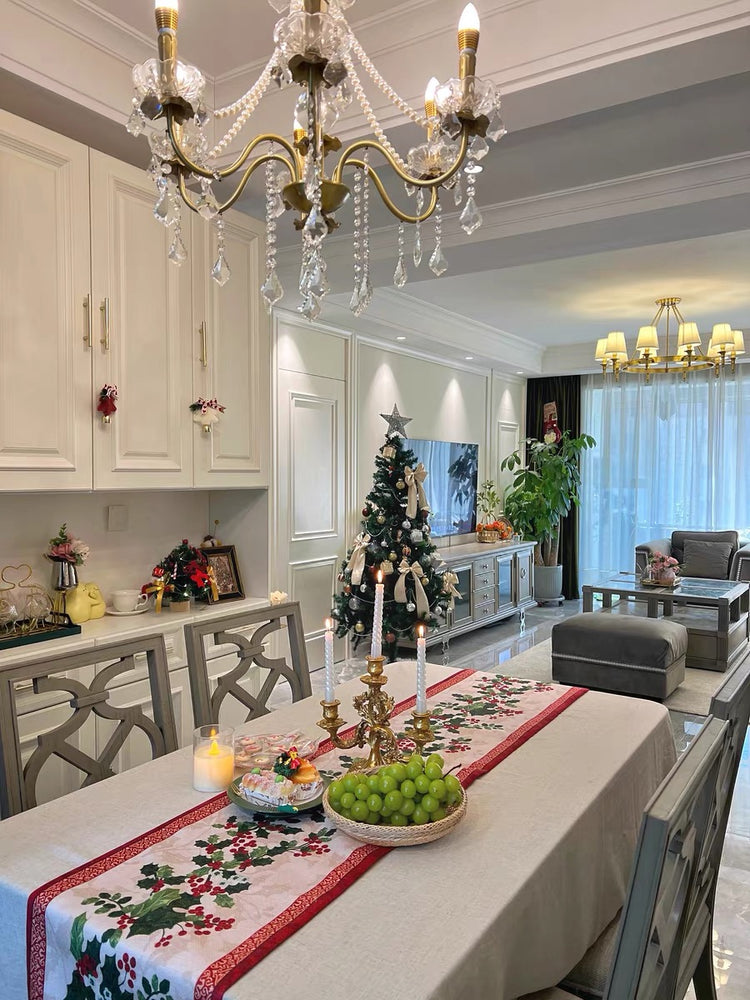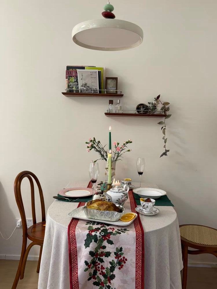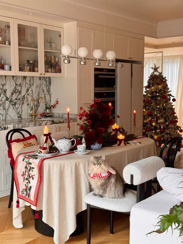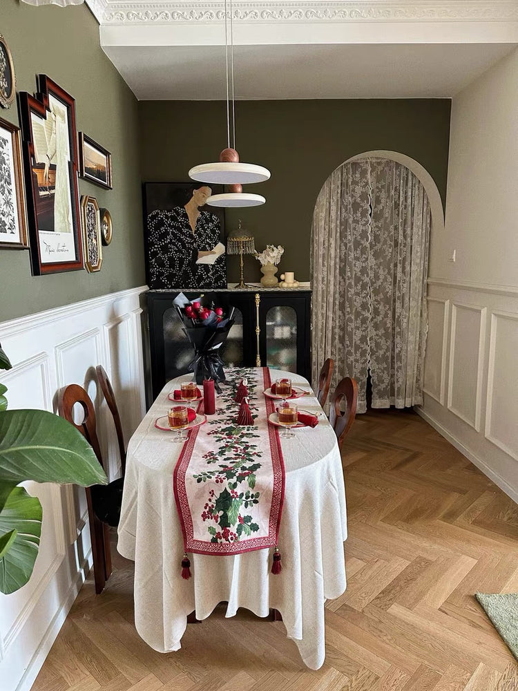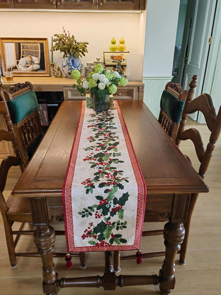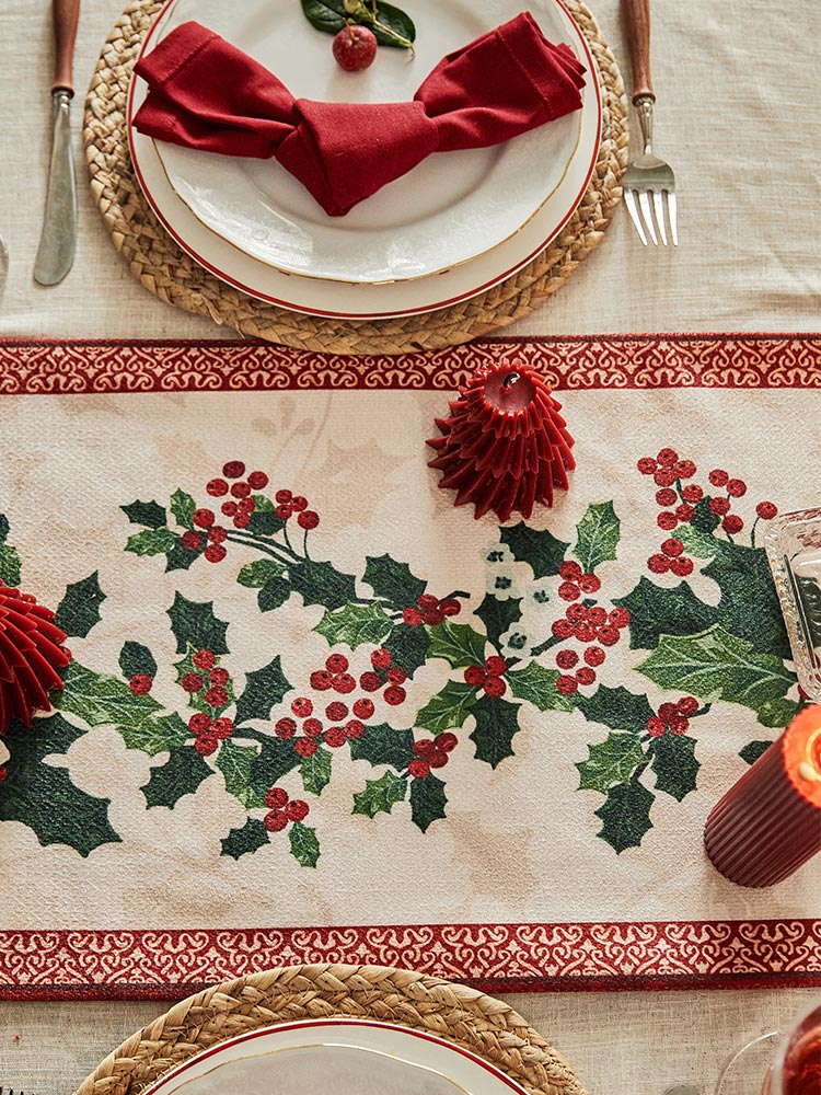 This table runner features a festive design with a red border and holly leaf pattern, making it perfect for Christmas celebrations.