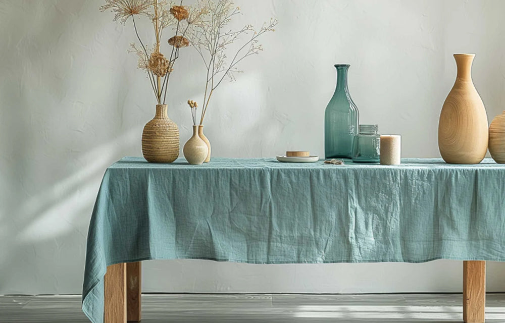 The designer was inspired by the calm serenity of the ocean on a peaceful day. The soft blue tone of this linen tablecloth reflects the tranquility of water, symbolizing relaxation, simplicity, and balance in nature. X