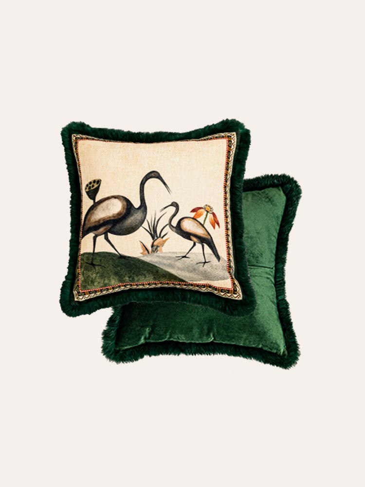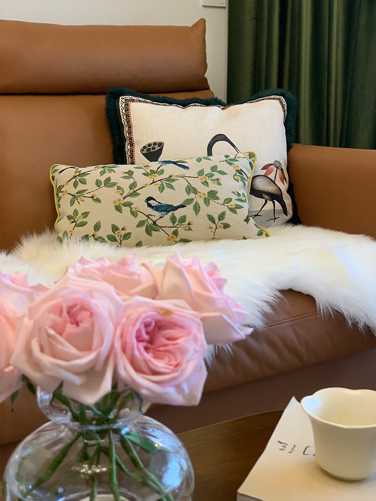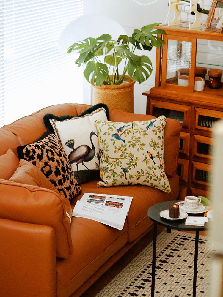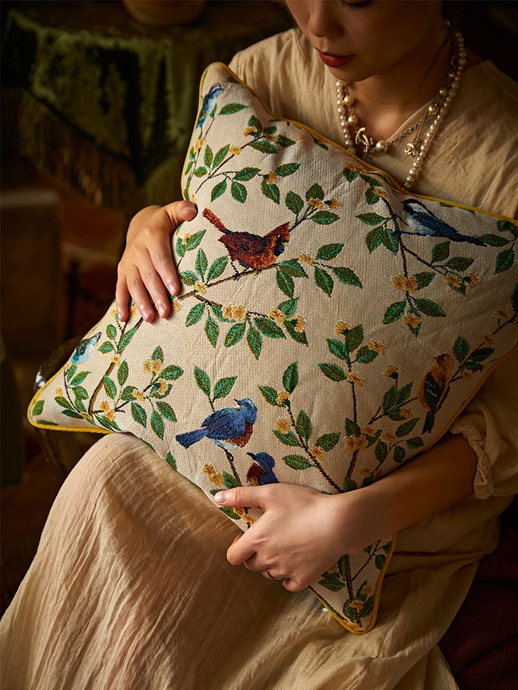 This parrot-themed pillow features a jacquard weave, creating intricate patterns with a rich texture. The detailed parrots and lush branches add depth and elegance, making it a stylish accent for any space.