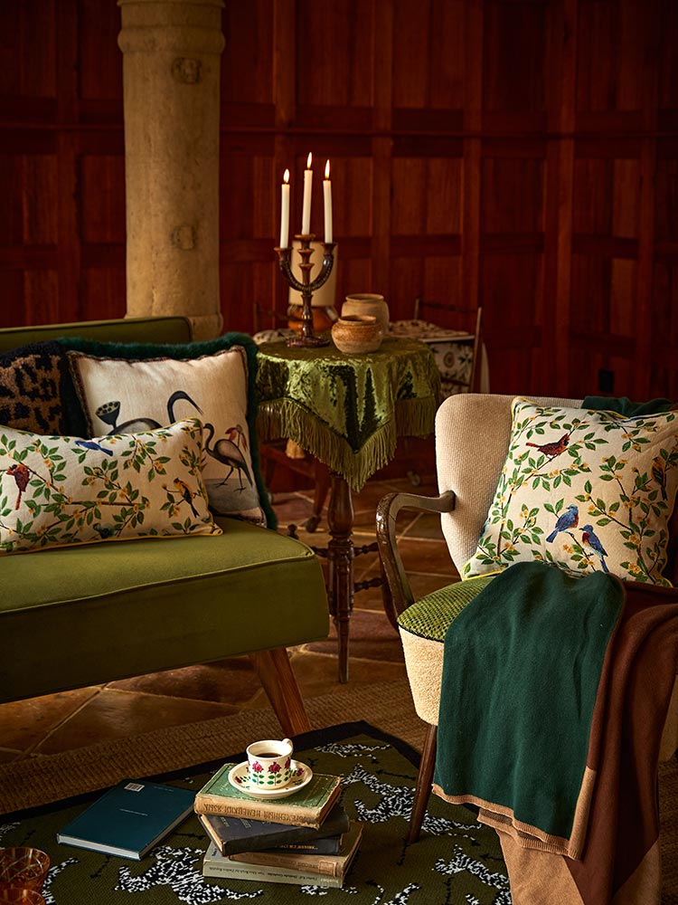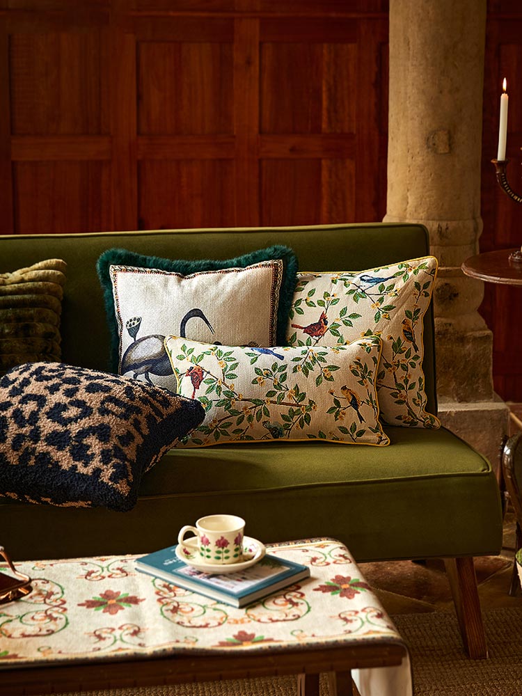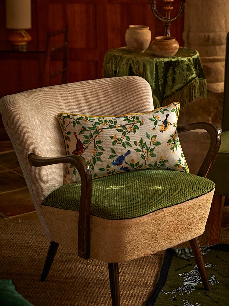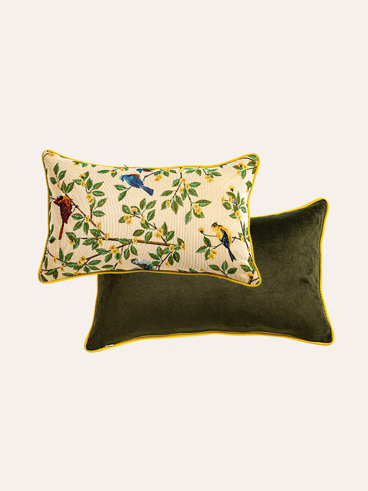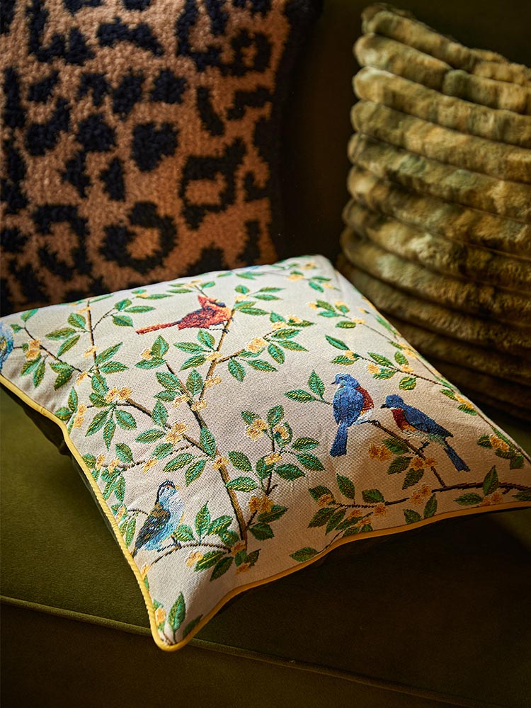 A charming cushion featuring vibrant parrots perched on lush branches, adding a touch of nature and elegance to any space.