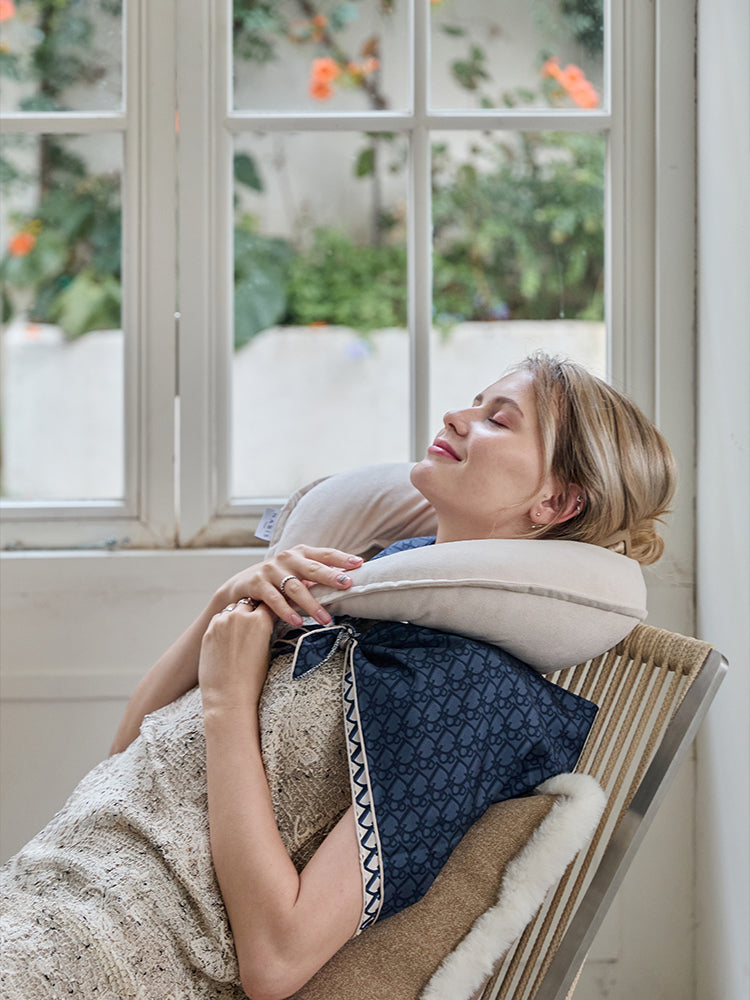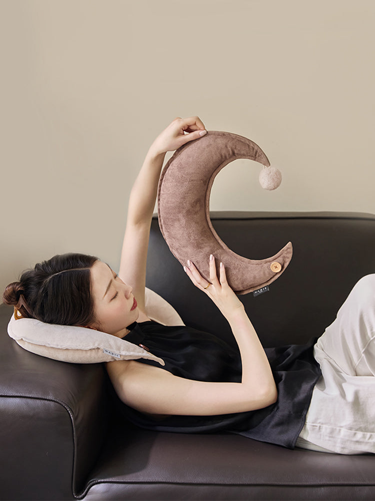 The pillow features a curved shape, small pom-poms, and delicate buttons. With a simple button fasten, it quickly transforms into a neck pillow, blending practicality and creativity .