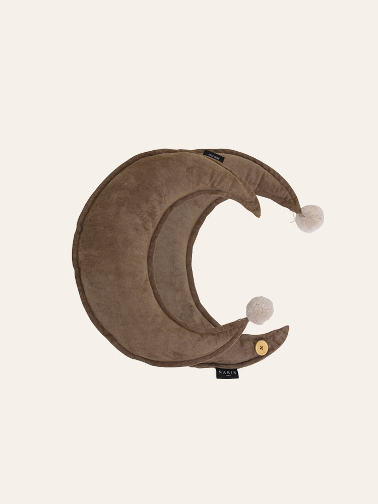 A cozy, crescent-shaped pillow with a soft plush surface and pom-pom accents, adding whimsy and comfort to any space.