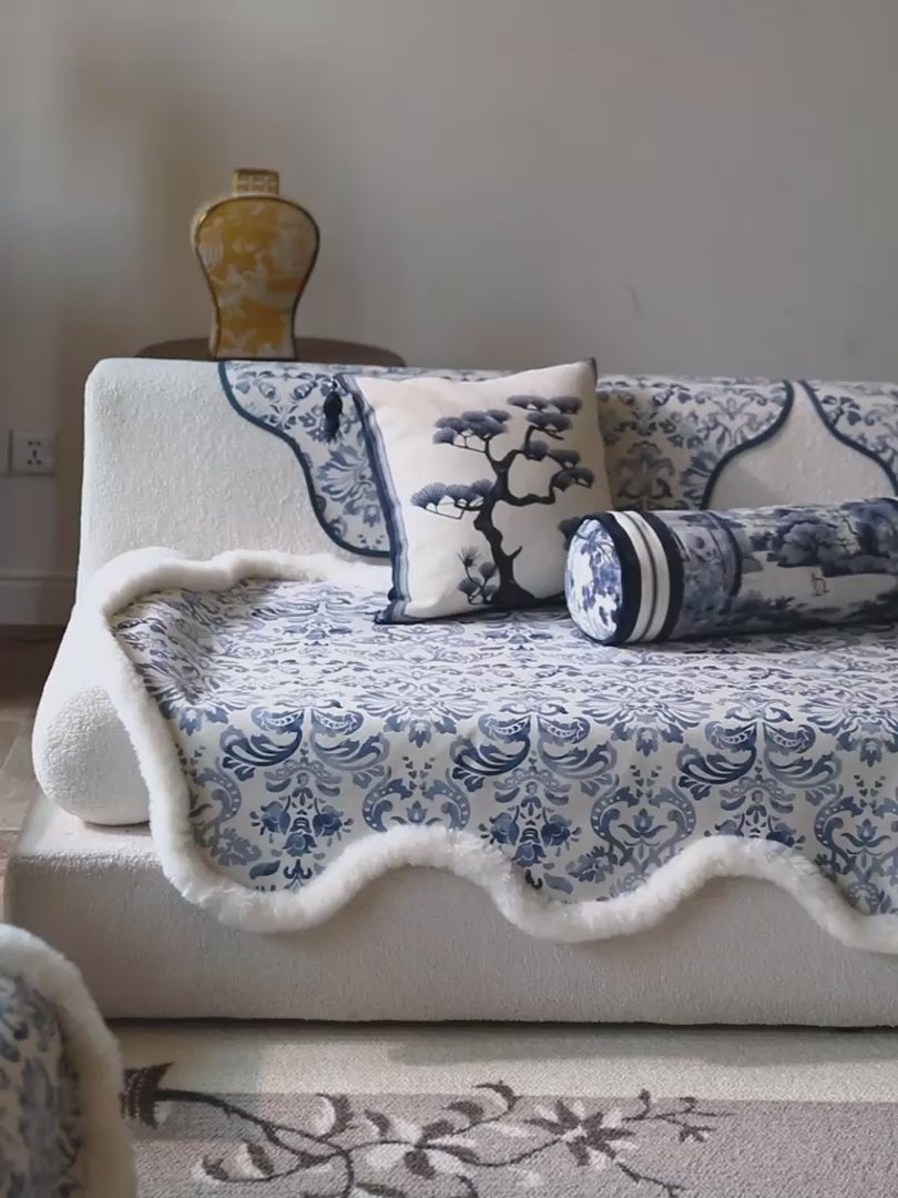 This blue damask sofa cover blends timeless ornamental beauty with a soft, plush trim—perfect for elevating your living space with refined charm and warmth.