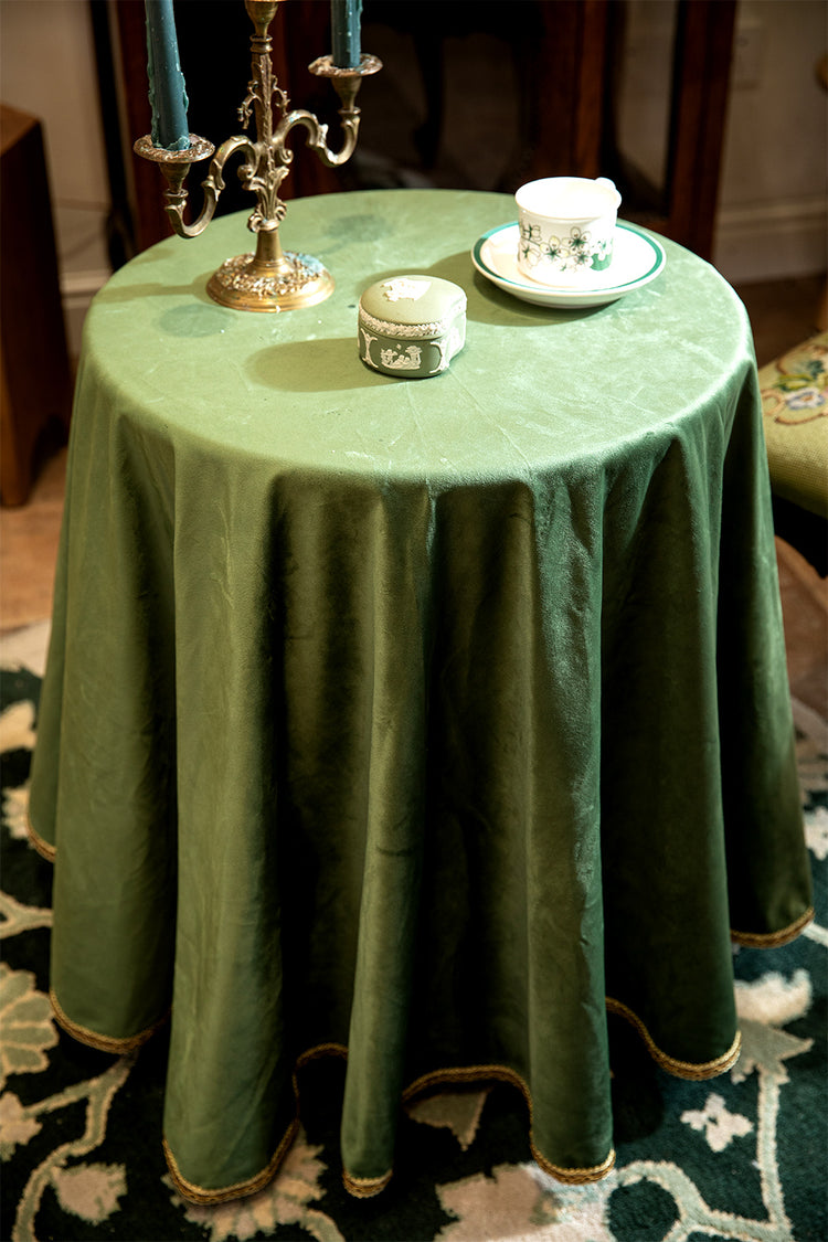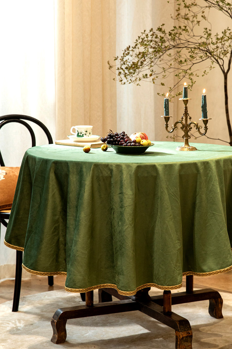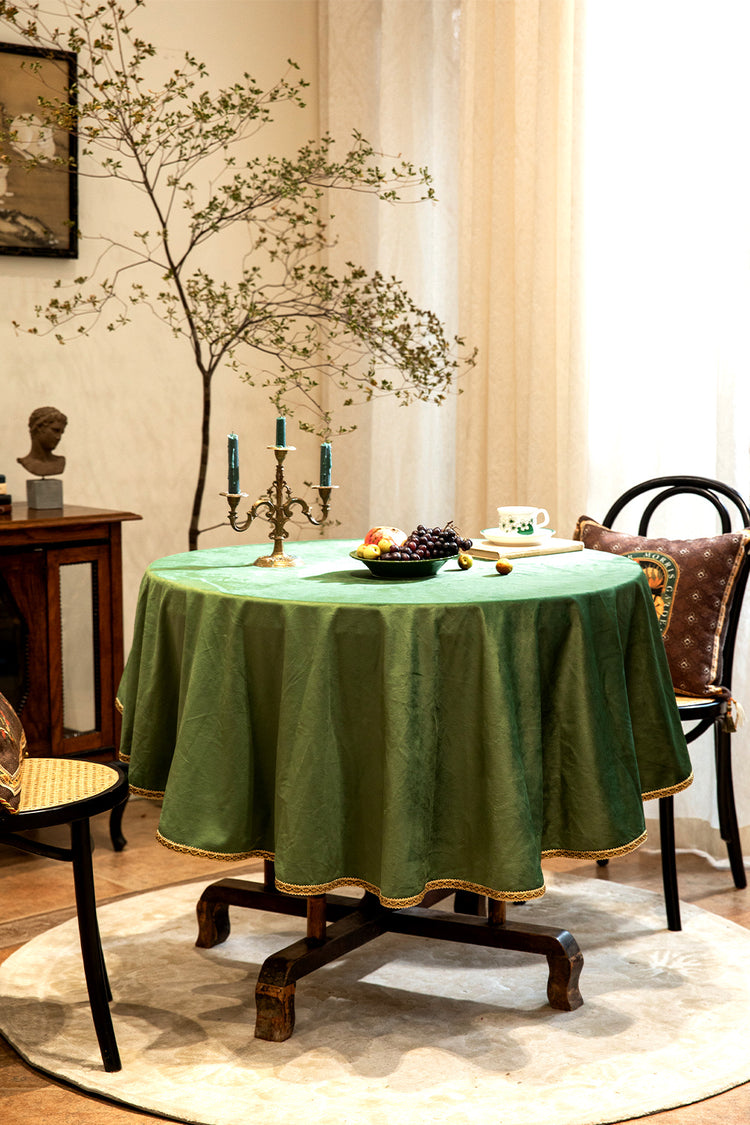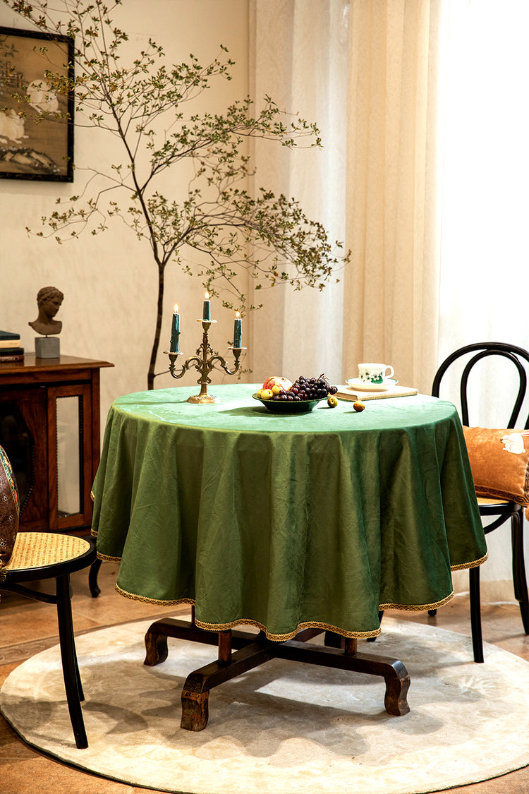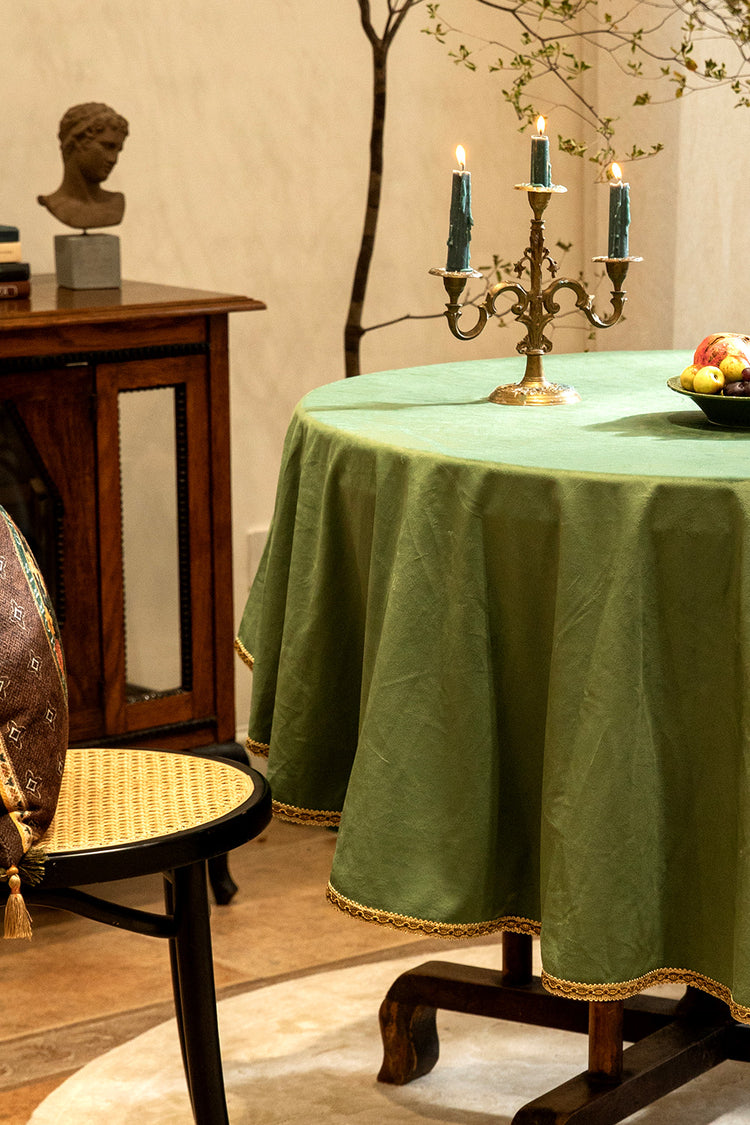 The designer found inspiration in classic European dining rooms, where natural hues like deep green, combined with subtle decorative trims, created a harmonious balance of simplicity and elegance. The understated beauty of this tablecloth reflects an appreciation for traditional design elements with a modern touch. X