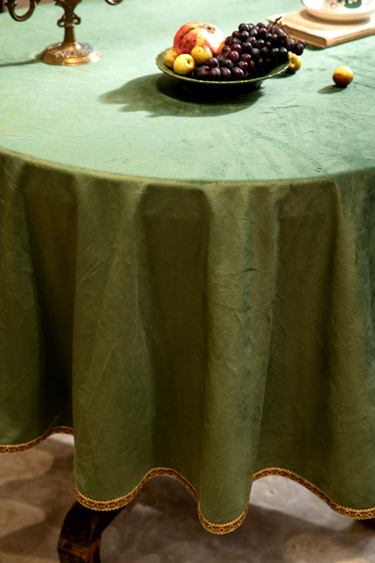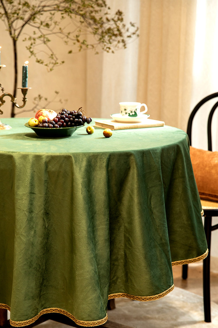 Verde Minimalist Christmas Solid Green Velvet Tablecloth Braided Edge / Dia. 55 Inches