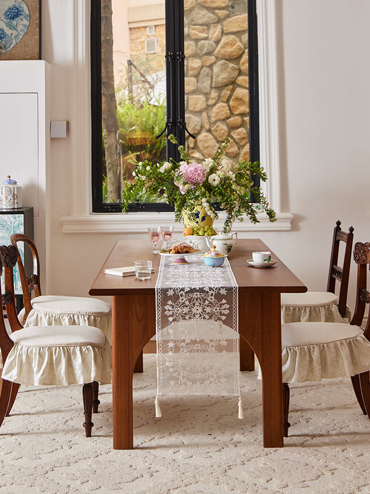 Like morning frost on a garden bloom, this lace table runner brings an ethereal charm—softly layering elegance over your dining space.